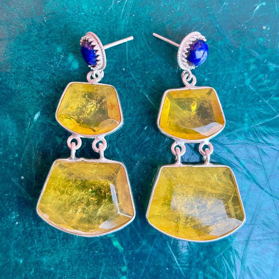 Boucles d'oreilles pendantes en Lapis Lazuli naturel et Quartz jaune faites à la main en argent sterling plaqué bijoux en pierres précieuses pour femmes