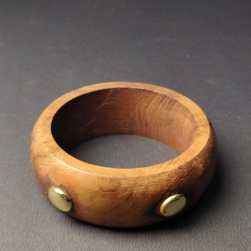 Bracelet manchette artisanal en bois naturel avec rivets cloutés en laiton poli, style punk, bijou de mode en bois