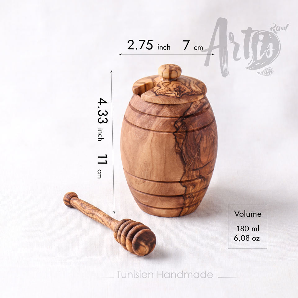 Pot à miel en bois d'olivier fait à la main ArtisRaw avec cuillère en bois, pot à miel écologique, ensemble de vaisselle en bois d'olivier de haute qualité