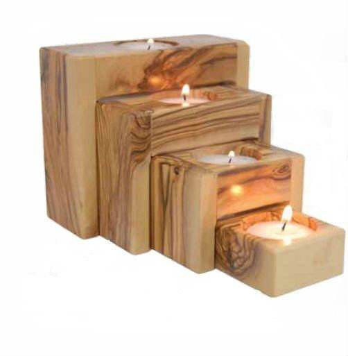 Handmade Olive Wood Stairs-Shaped Tealight Holder 4-Piece Set for Christmas Home Decoration with Lanterns and Candle Jars