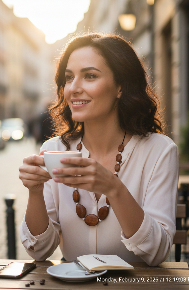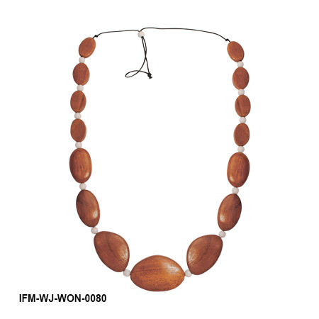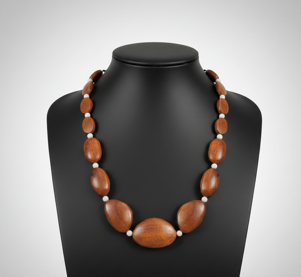 Collier artisanal en bois de longueur opéra : Formes de bonbons variées avec entretoises en résine blanche et finition cirée