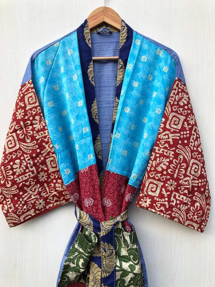 Robe kimono en soie patchwork faite à la main pour femmes, grande taille, respirante, longueur genou, imprimé indien, style bohème, vêtement de nuit d'automne