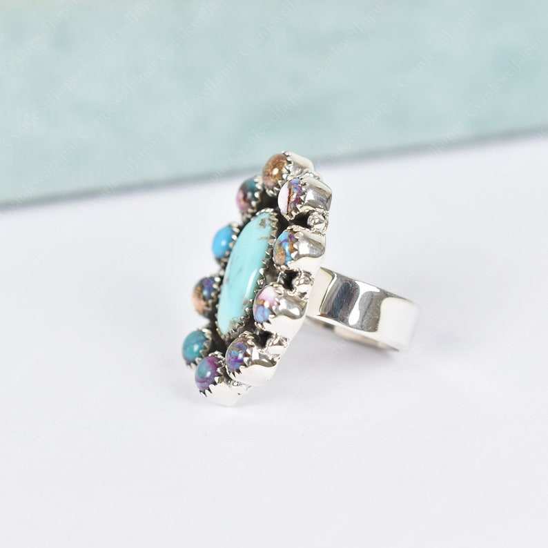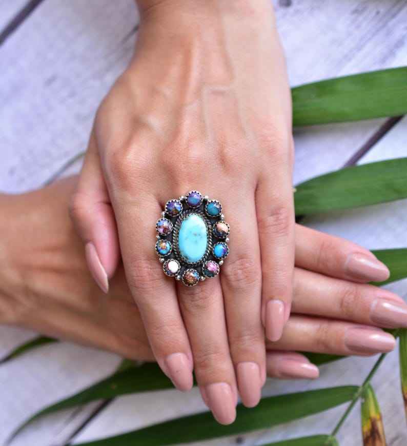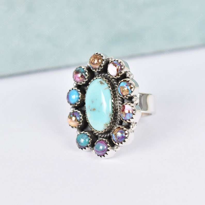Handmade Pink Dahlia Turquoise 925 Sterling Silver Adjustable Statement Ring
