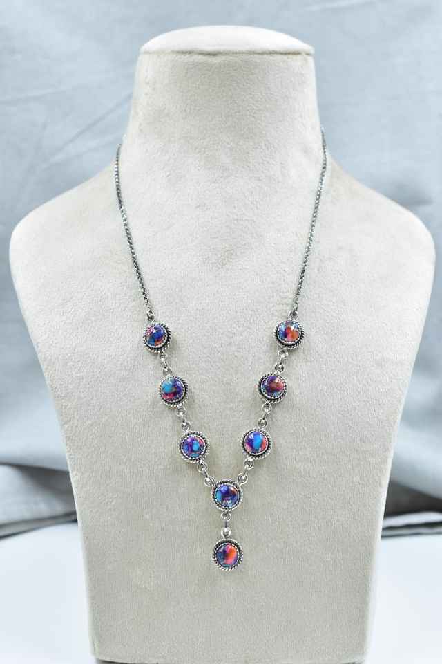 Handmade Boho Statement Necklace 18 Inch Adjustable Chain Pink Dahlia Turquoise Sterling Silver Lariat Rhodium Plated Jewelry