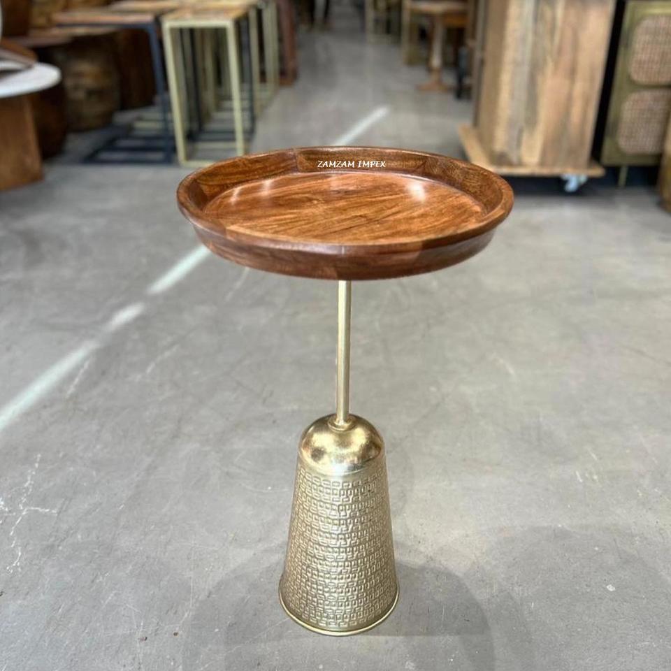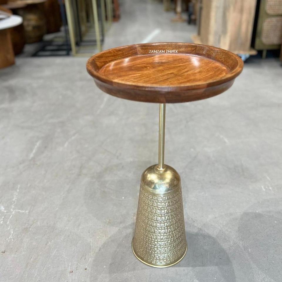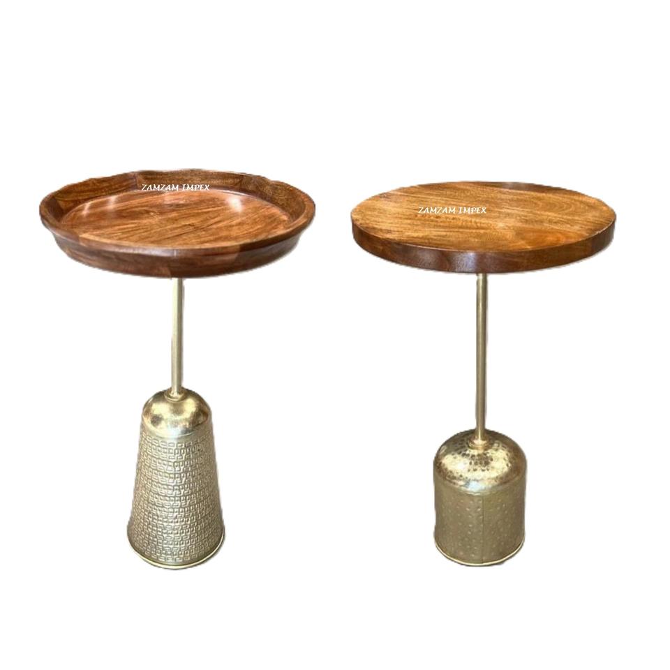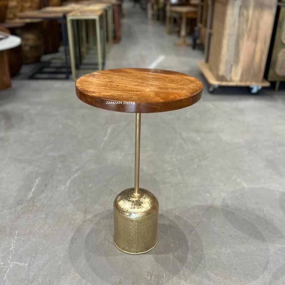 Table basse ronde en bois poli fait à la main avec base en métal robuste, design industriel rustique de haute résistance pour le salon