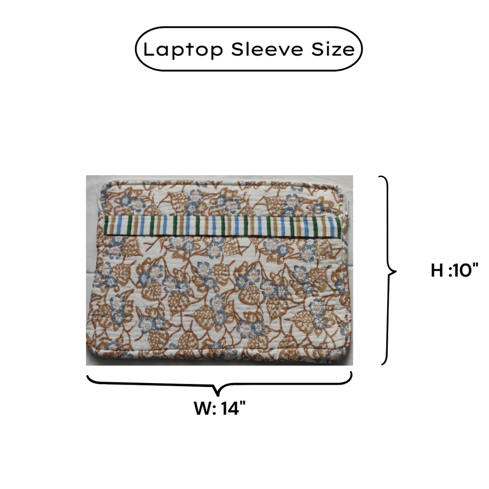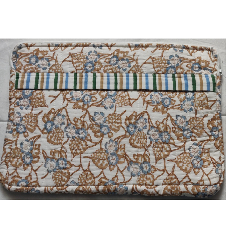 Housse pour ordinateur portable en coton doux et durable, écologique, matelassée, à multiples poches zippées, imprimée à la main par des artisans du Rajasthan