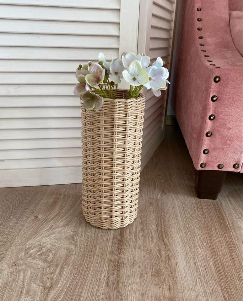 Vase à fleurs en rotin fait main avec des détails rustiques, parfait pour les intérieurs bohèmes, maisons de campagne et espaces de ferme confortables et élégants