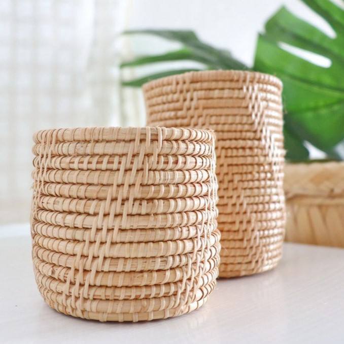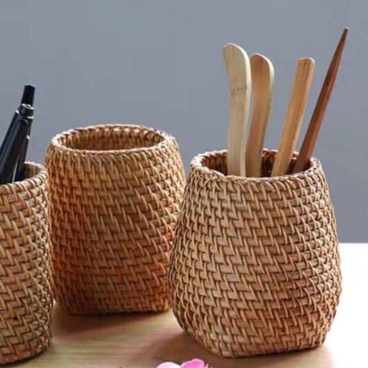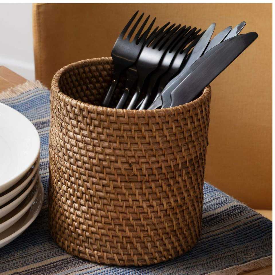 Panier de rangement cylindrique en rotin fait main pour couverts, écologique, pour fourchettes, cuillères et couteaux