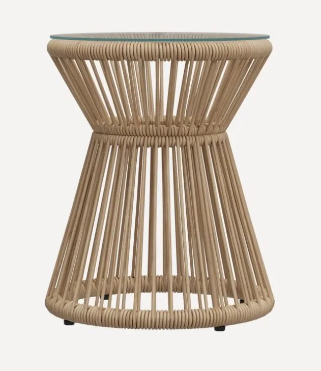 Table Tedory en rotin fait main avec surface en verre ronde, design moderne et durable pour les intérieurs