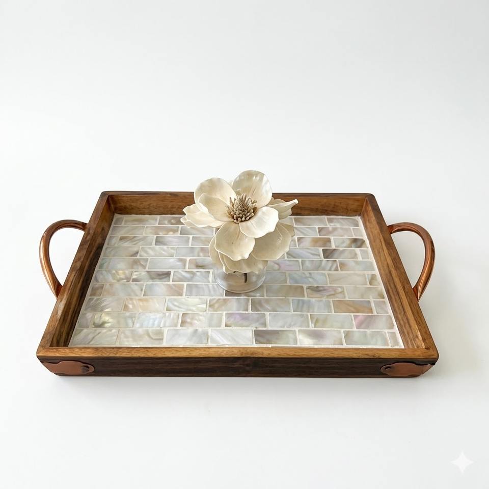 Plateau de service rectangulaire en rotin tressé fait main avec nacre, décoration naturelle pour la maison, plateau de table basse, cadeau unique, cuisine