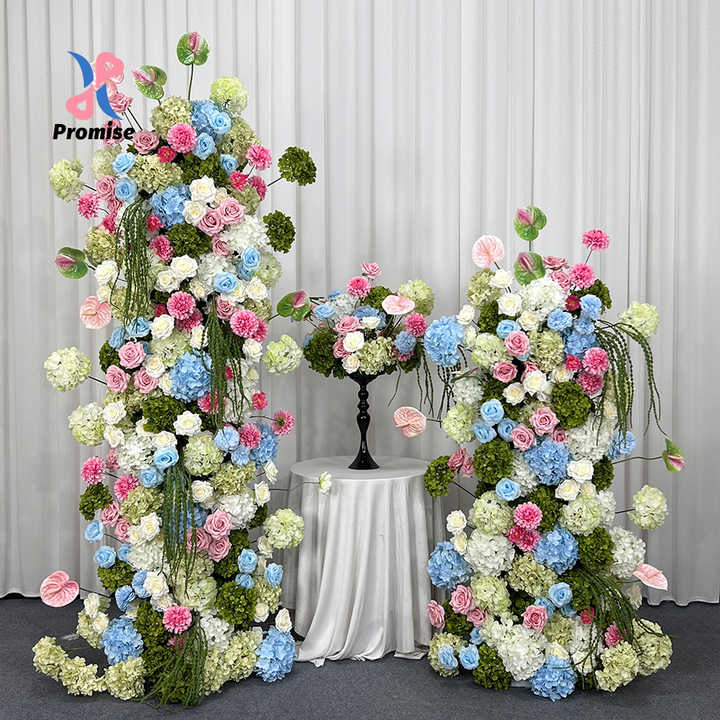Arche florale en soie réaliste faite à la main en rose pastel, bleu et blanc pour la décoration de fond de lieu de mariage