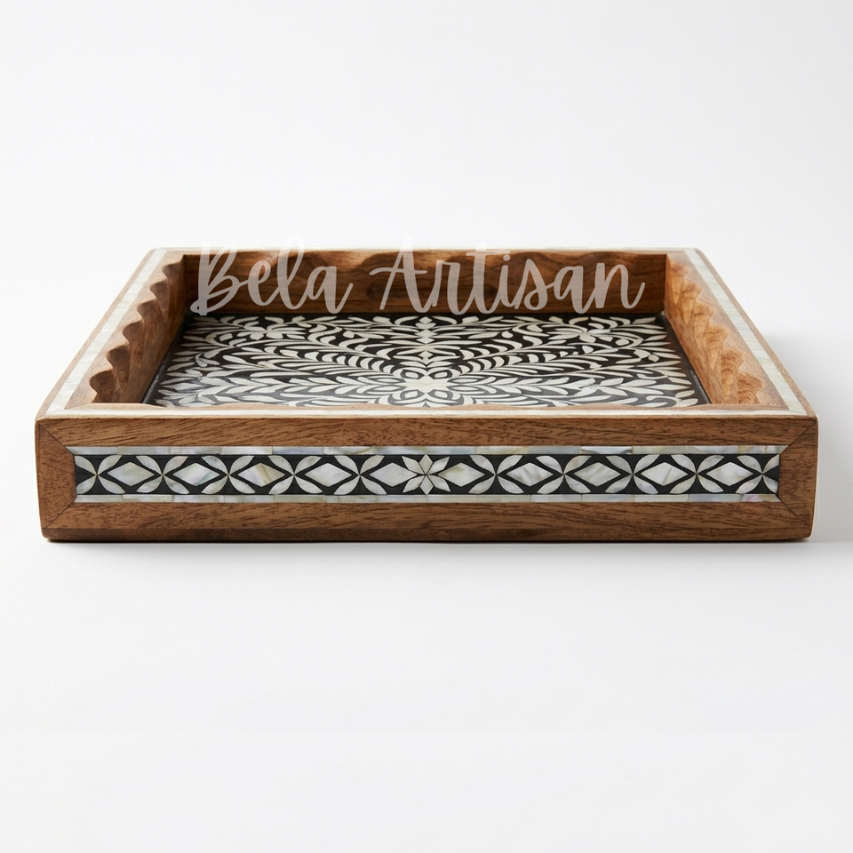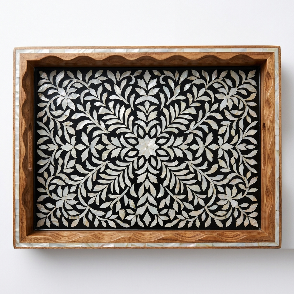 Plateau rectangulaire en bois Papdi fait main avec incrustation florale en nacre, plateau de service décoratif et mobile pour le Ramadan et les mariages