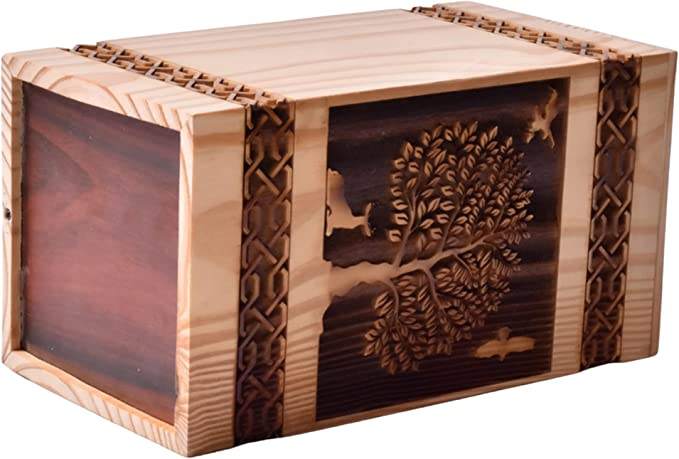Urne funéraire artisanale en bois rectangulaire Arbre de Vie pour cendres humaines, personnalisée et fabriquée à la main, pour usage au bureau