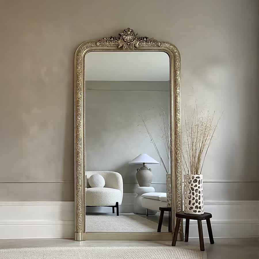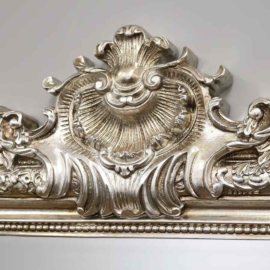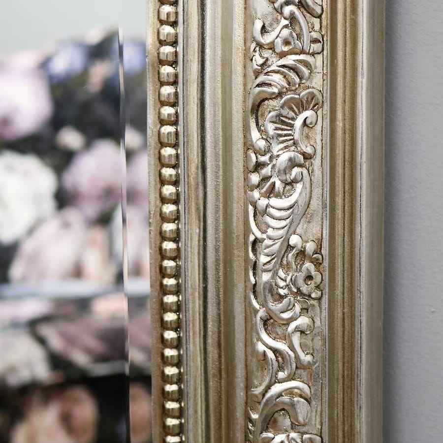 Miroir sur pied rectangulaire en teck massif fait main avec finition argent antique, cadre orné classique, miroir écologique