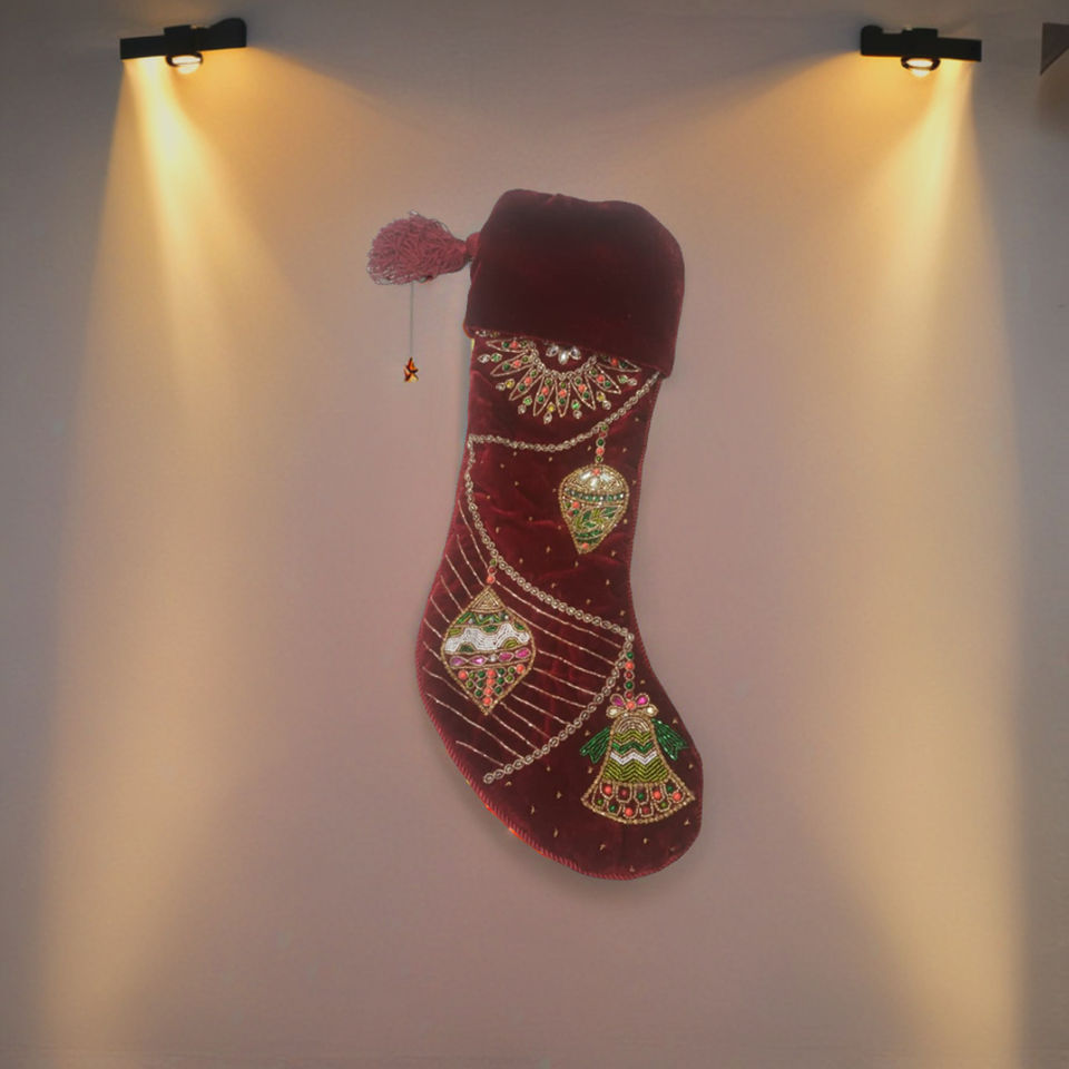 Bas de Noël en velours rouge fait à la main avec broderie d'ornement et perles Décoration et cadeau de cheminée de vacances de luxe en Inde