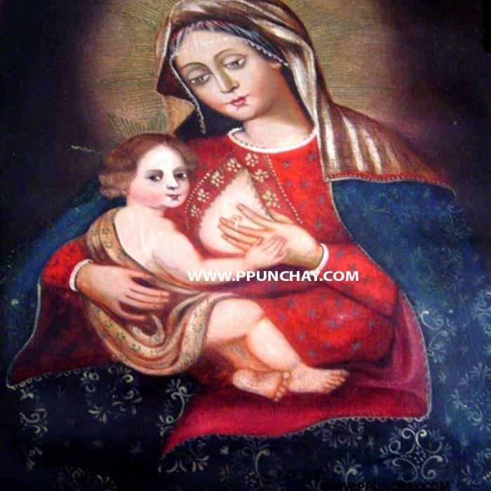 Peinture sur toile religieuse artisanale de la Vierge du Lait, 40 x 30 CMS, 15x11 pouces, école de Cusco, huile sur PPunchay, Pérou
