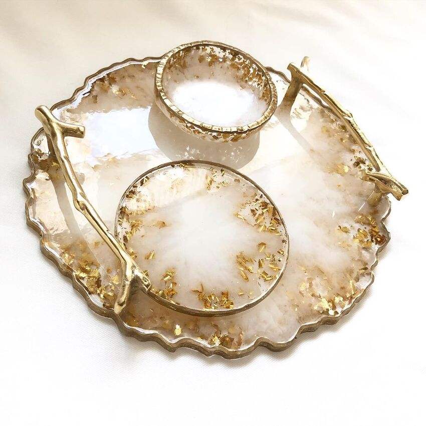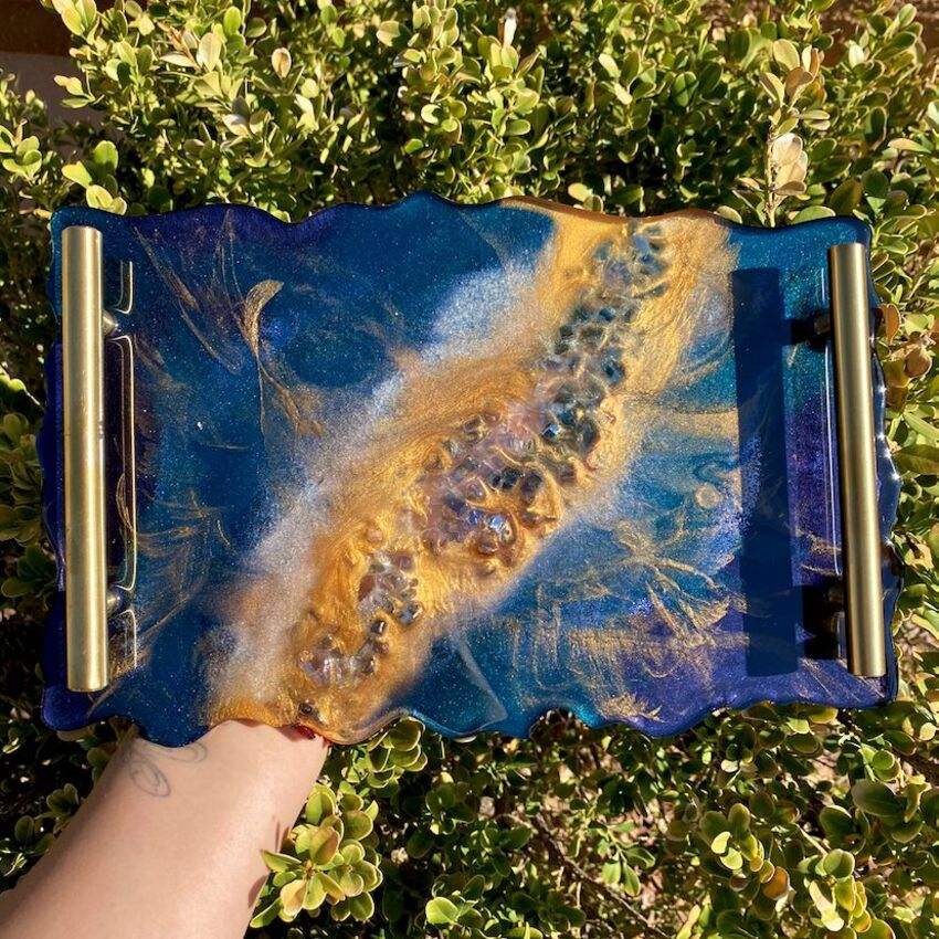 Plateau de chargeur en résine fait main finition moderne colorée personnalisable 100 pièces pour afficher des collations de fruits de desserts ajoutant du charme