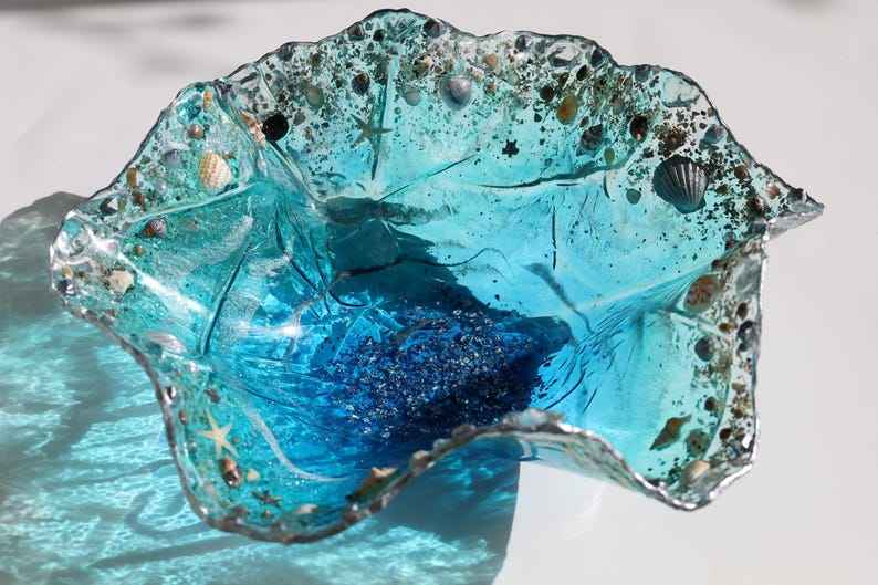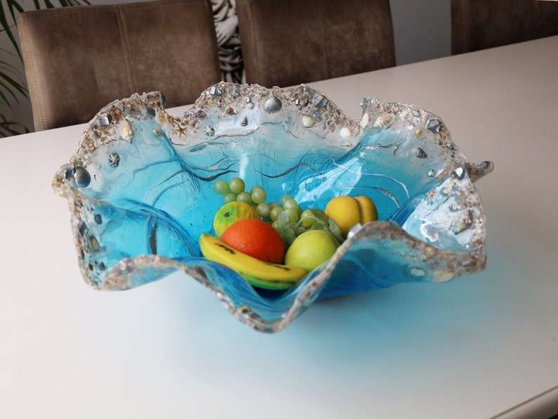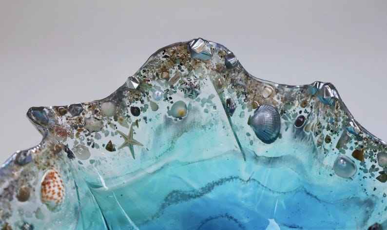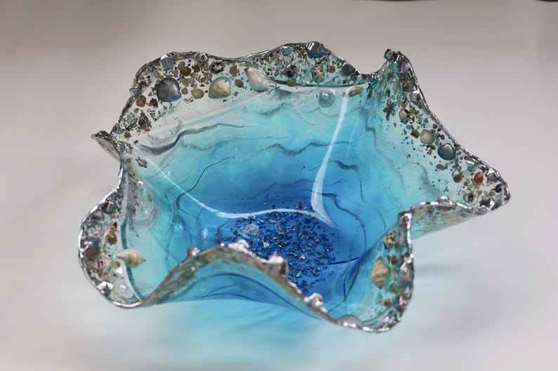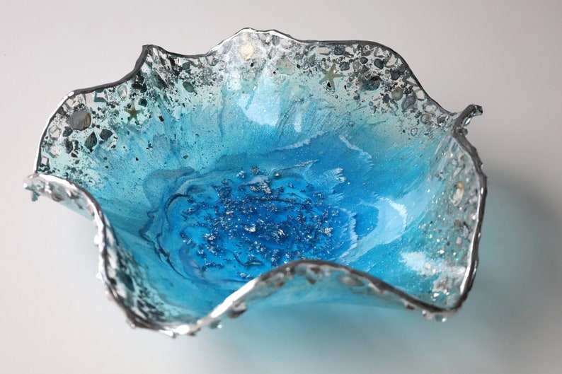 Bol en résine fait main motif océan avec flocons et accents argentés – Idées de décoration intérieure, bol décoratif, idées cadeaux, art géode, art en résine