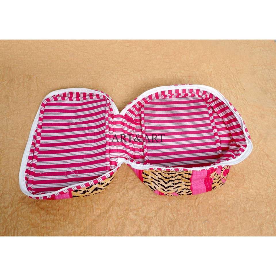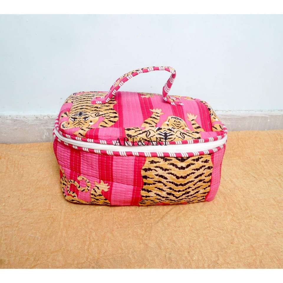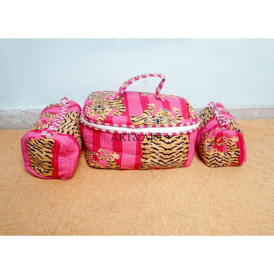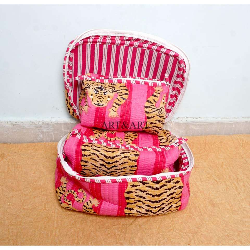 Ensemble de 3 trousses de toilette multifonctionnelles réutilisables faites à la main, grand format, avec fermeture éclair, motif tigre rose imprimé en bloc, durable