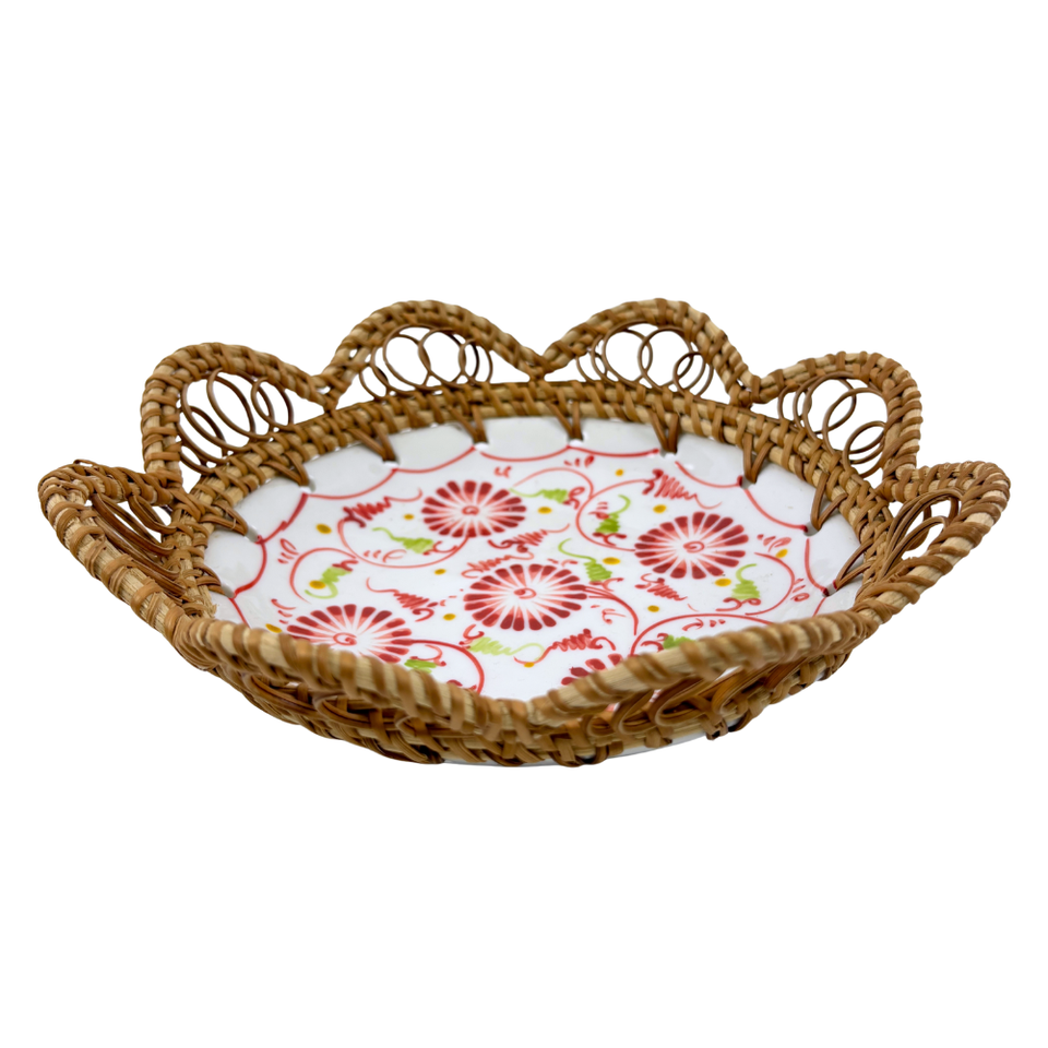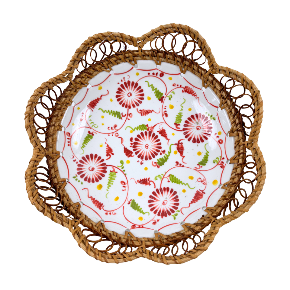 Bol de service rond en céramique artisanale vintage avec motif floral rouge, bord en rotin tressé écologique pour la décoration de la maison et les fêtes