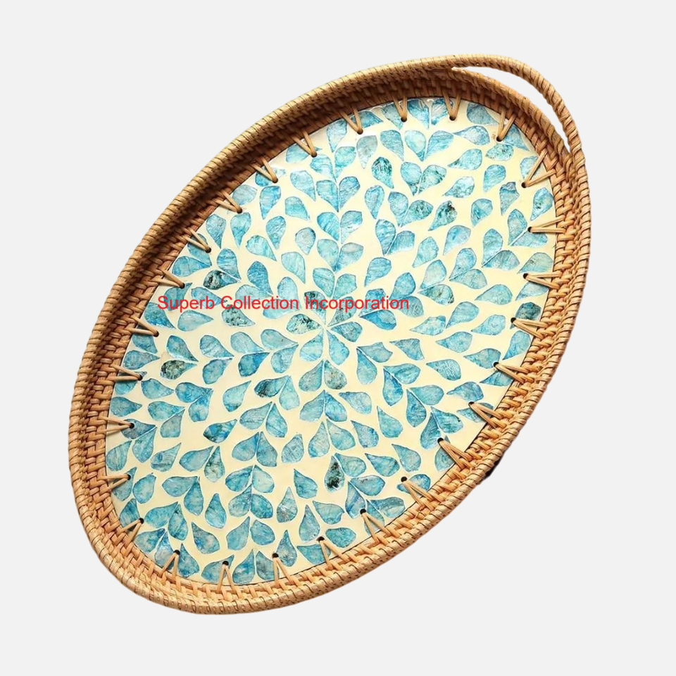 Plateau de service en rotin rond fait à la main avec incrustation de nacre Plateau de décoration de table basse pour la maison et la cuisine au prix de gros