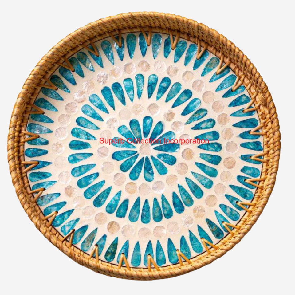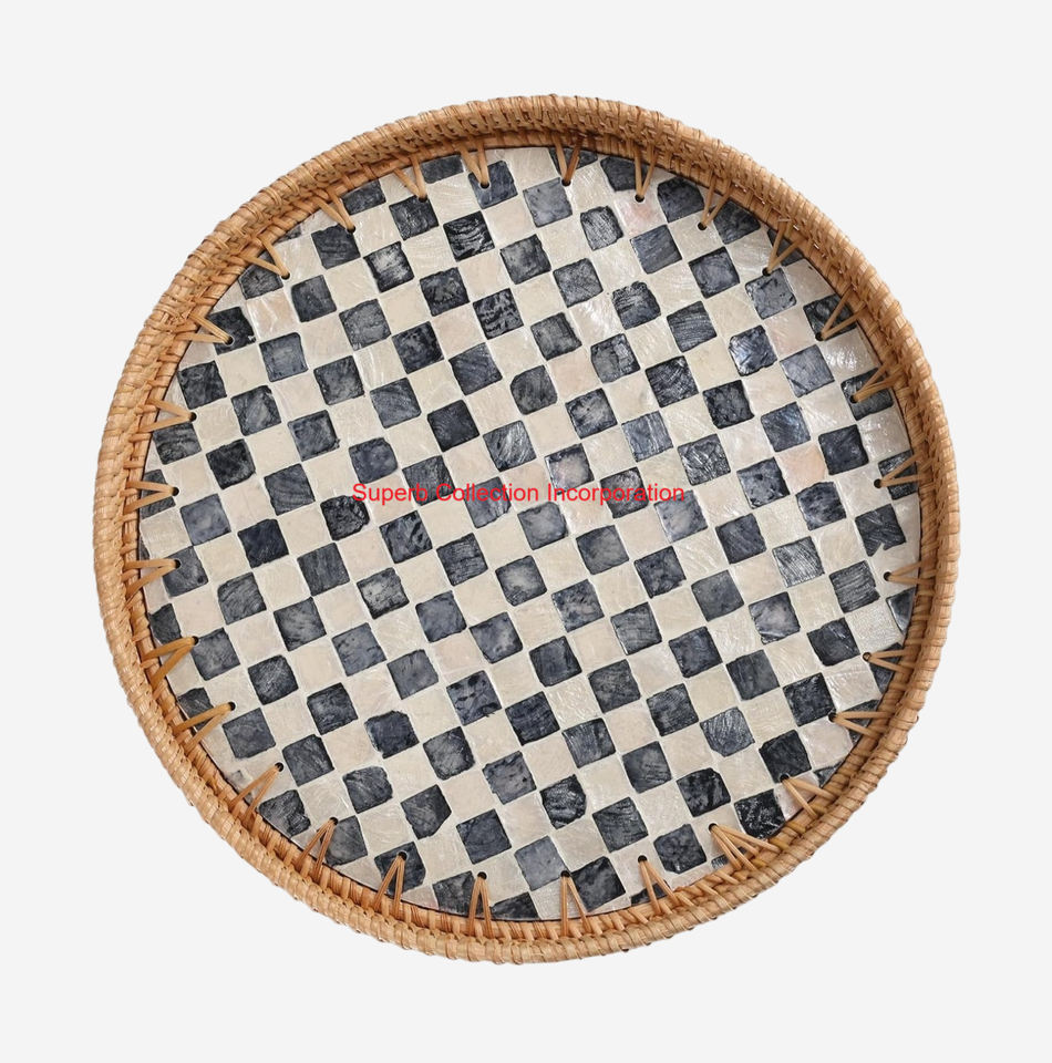Plateau de service rond en rotin fait main avec incrustation de nacre Plateau de canne tissé décoratif pour la cuisine, la salle à manger et la décoration intérieure