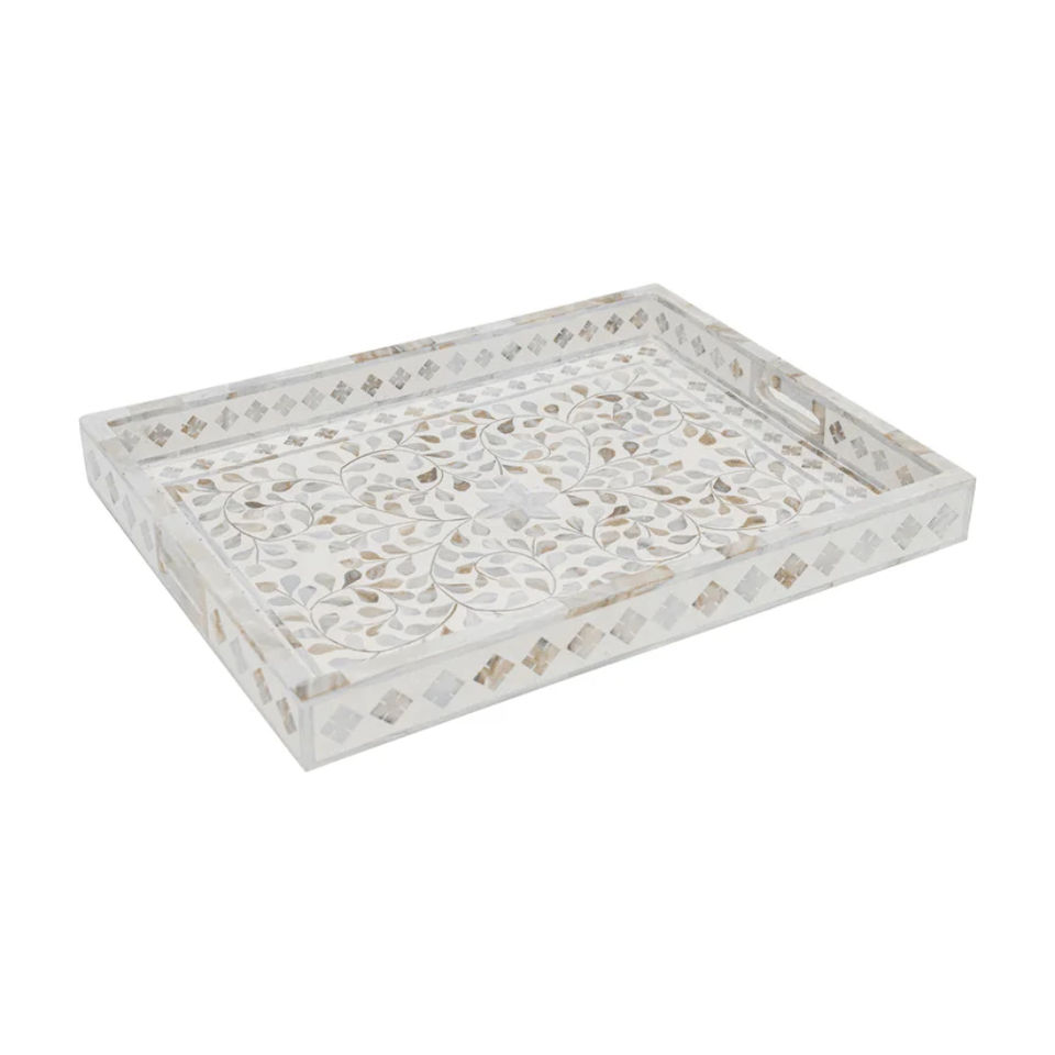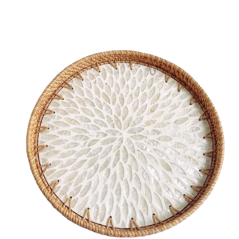 Plateau de service rond en rotin fait main avec motif mandala blanc nacre, plateau décoratif pour table basse, pour la décoration de la maison