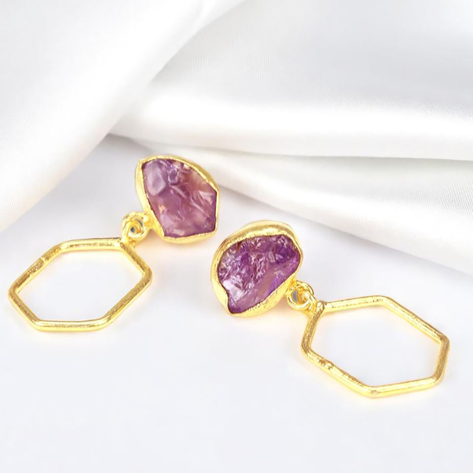 Boucles d'oreilles artisanales en pierres brutes de rubis | Boucles d'oreilles hexagonales en argent 925 plaqué or, bijoux