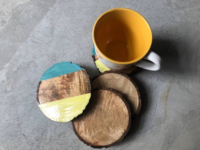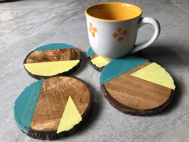 Dessous de verre en bois et pierre rustiques faits à la main, art tribal unique ou tampons à boisson imprimés floraux pour la décoration de la maison et du bureau
