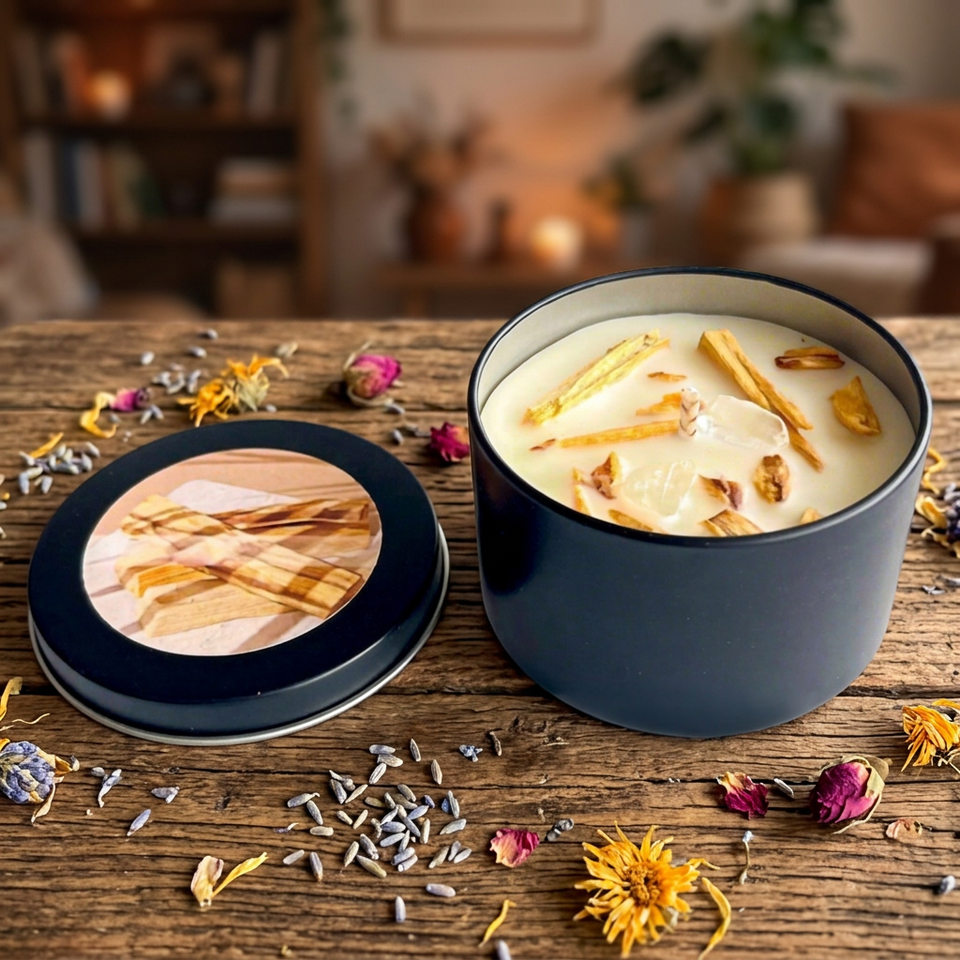 Bougie artisanale d'aromathérapie à la sauge, cèdre, lavande et Palo Santo du Pérou, en cire de soja, avec cristaux naturels pour purification et purification, dans un bocal noir