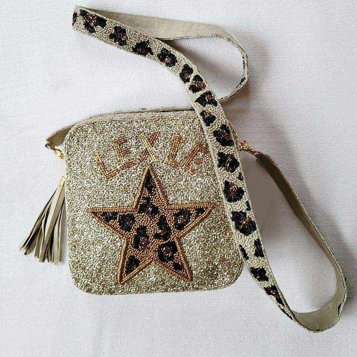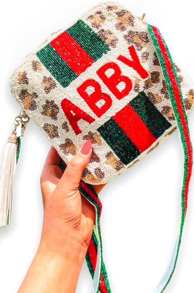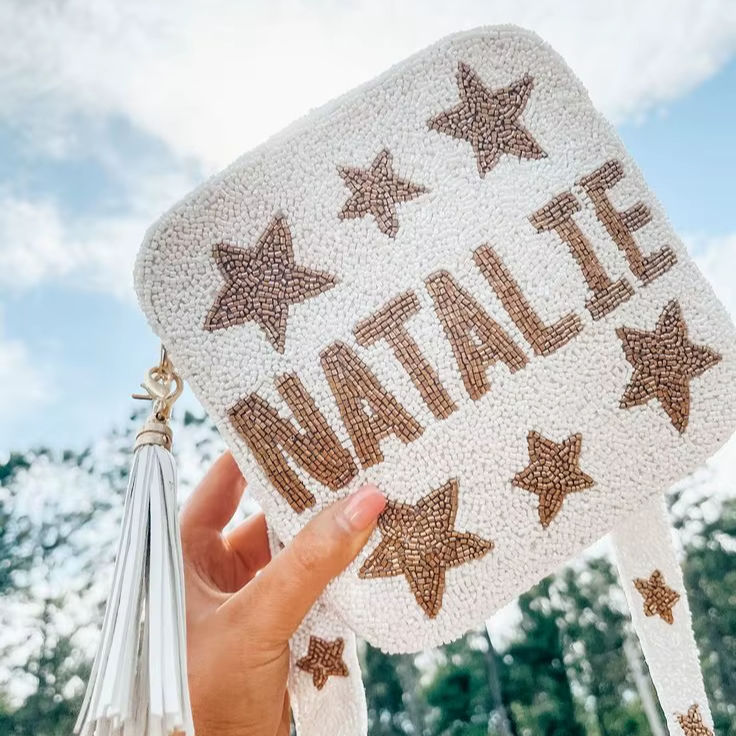 Sac messager fait main en perles de rocaille, sac à bandoulière personnalisé avec lettres perlées et sangle à pompon, sac à main carré en toile pour femme, idéal pour les voyages