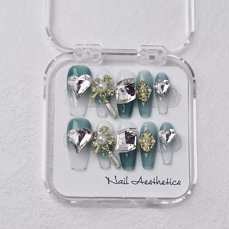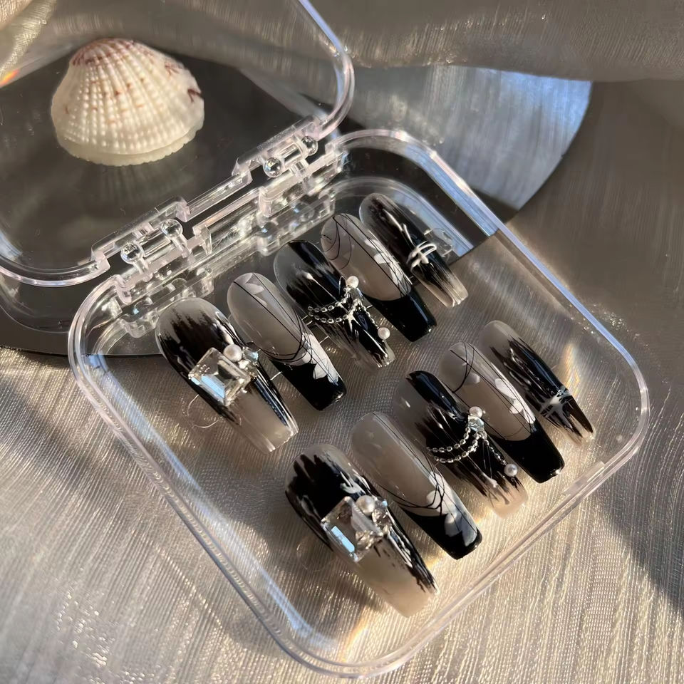 Cercueil court fait à la main ongles artificiels faits à la main presse sur les ongles faux 3D acrylique DesignRhinestone luxe Long cercueil