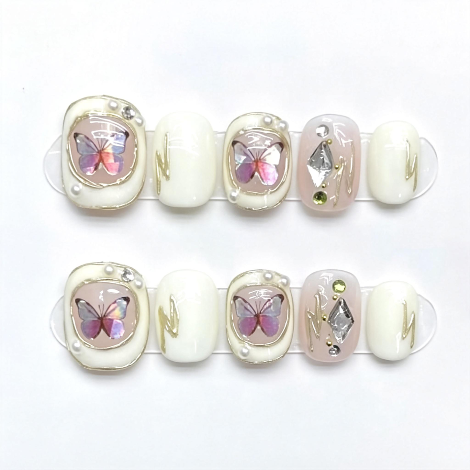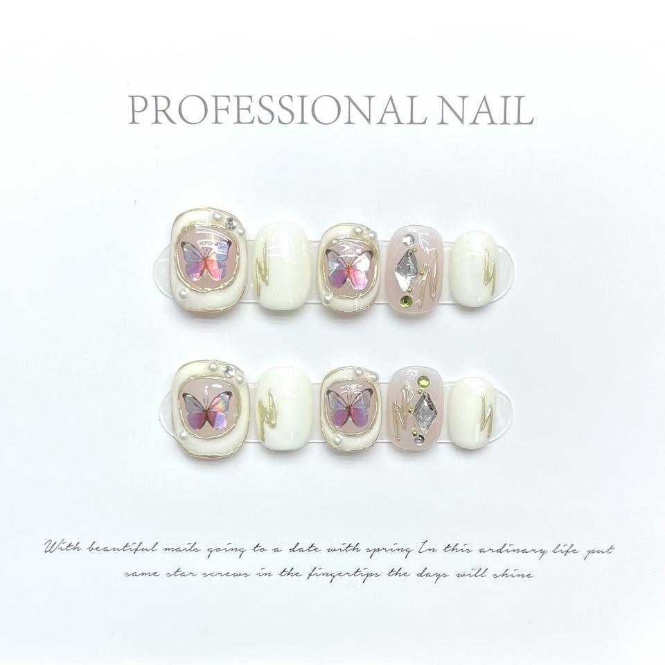 Ongles courts carrés-ovales faits à la main, effet papillon laser blanc, bordure dorée et cristaux, style français élégant et chic