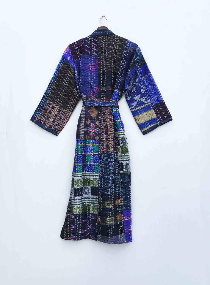 Veste Kantha en patchwork de soie faite à la main, style kimono japonais, vêtement de plage bohème, hiver, multicolore, ceinture à nouer