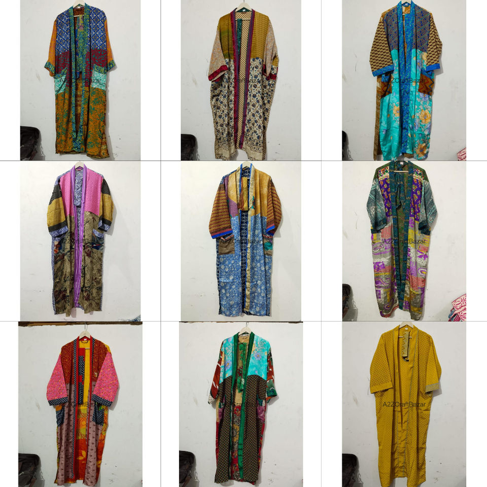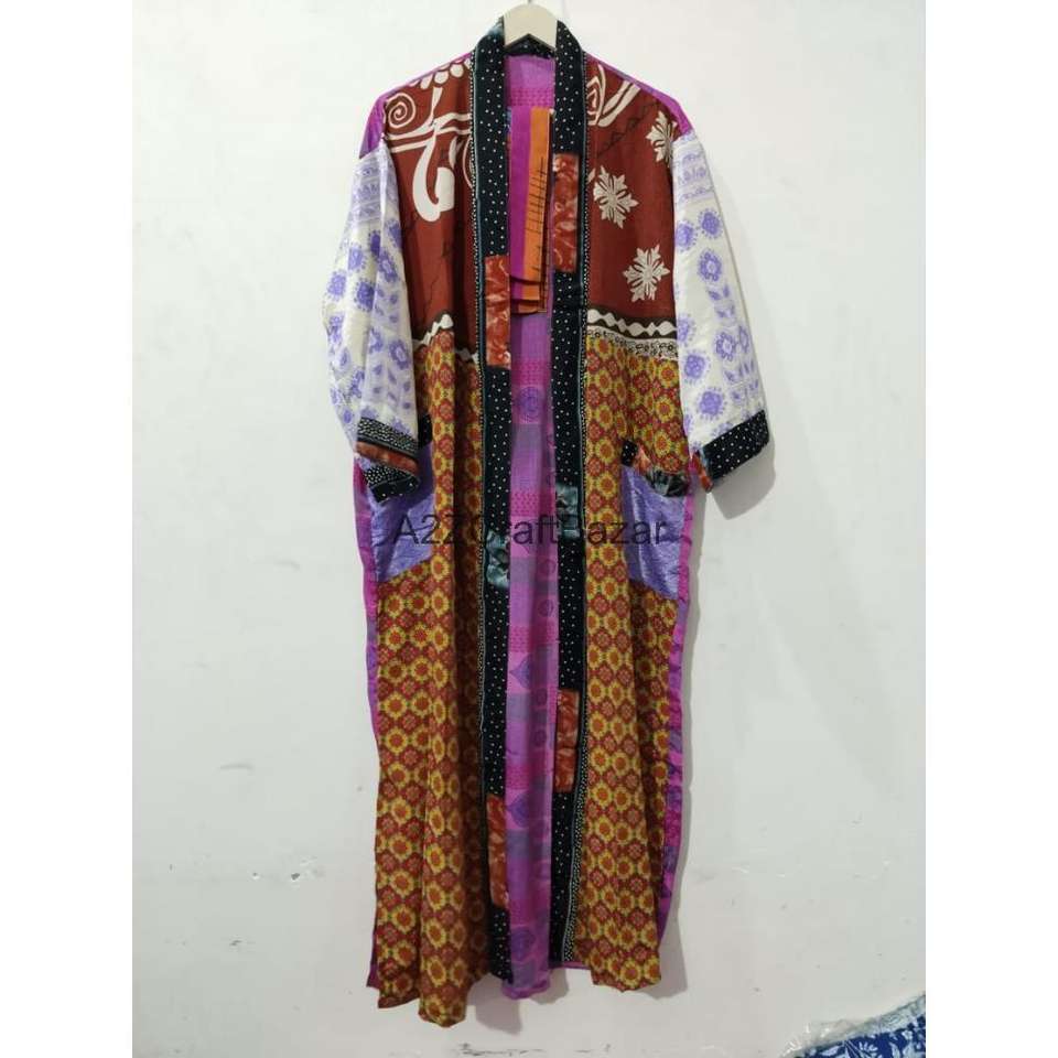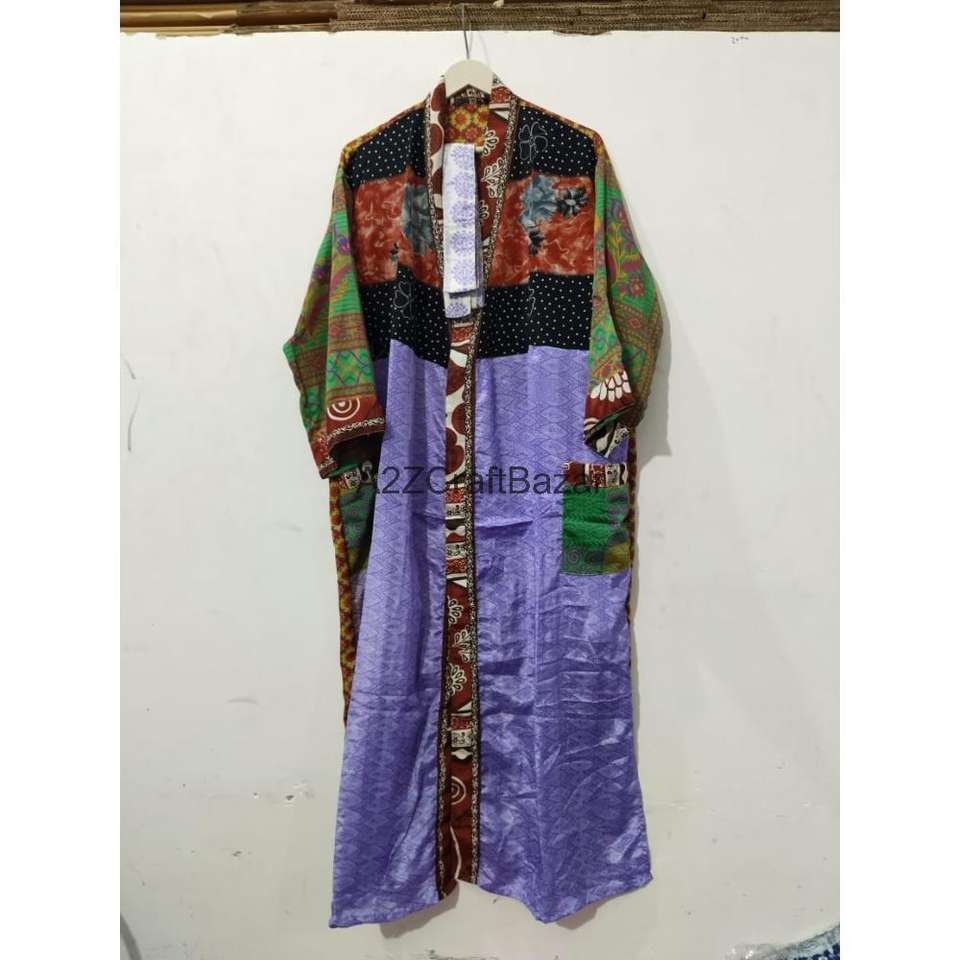 Handmade Silk Patchwork V-neck Drawstring Closure Full Length Soft Breathable Gown Lounge Wear Kimono Party Gown for Women Boho