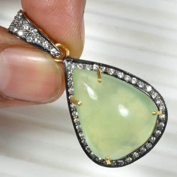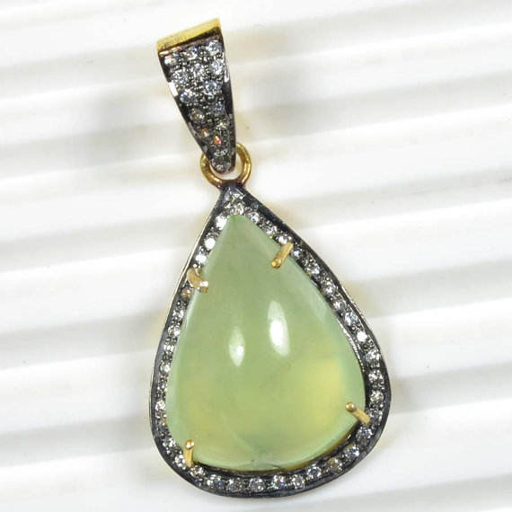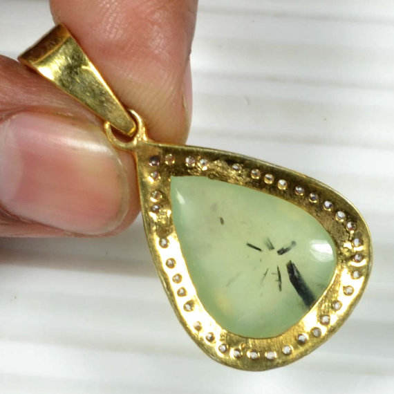 Pendentif artisanal en argent sterling 925 massif rhodié, serti de diamants CZ et pierre précieuse Prynite dorée, charm fin pour fête bohème