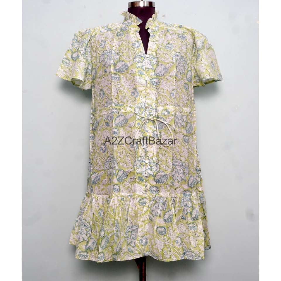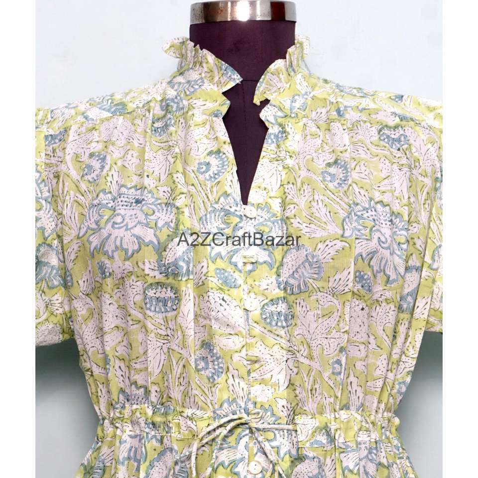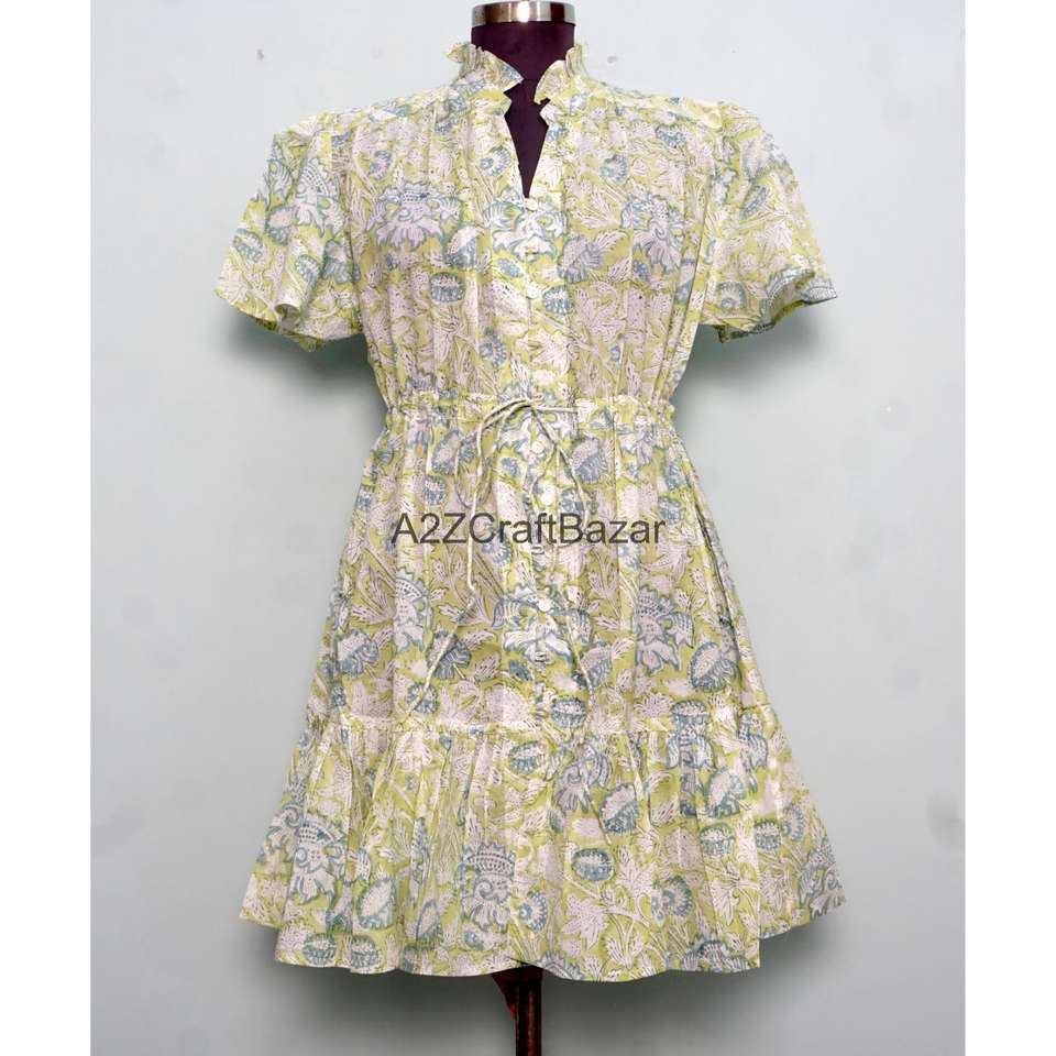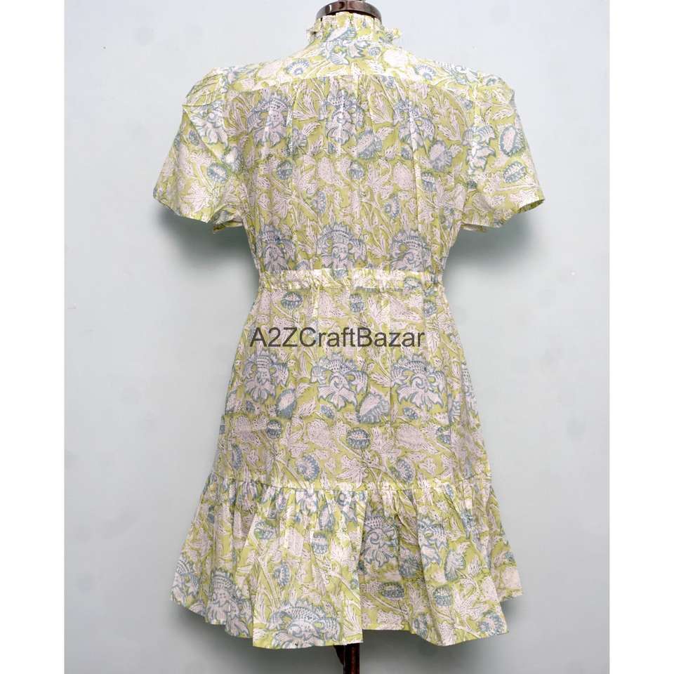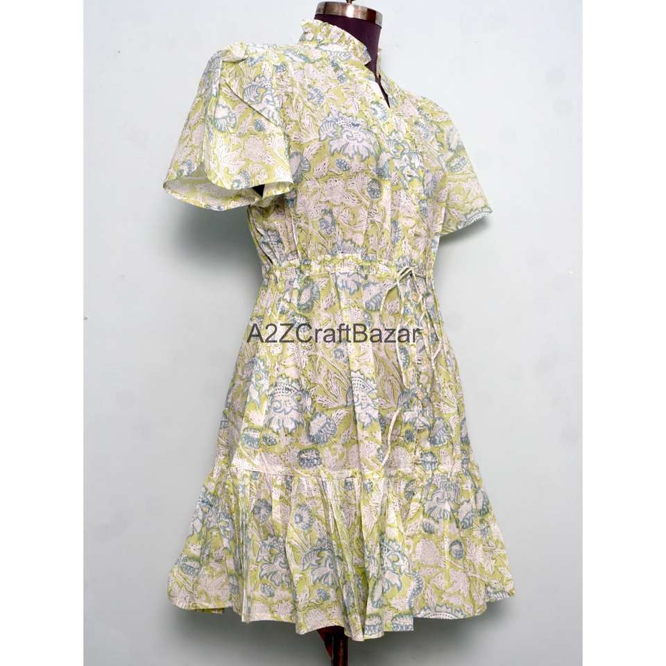 Robe courte élégante faite à la main pour le printemps, 100 % coton, imprimé floral, coupe trapèze, manches courtes, col en V