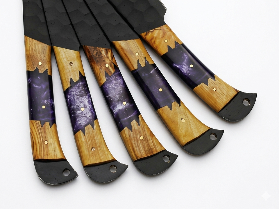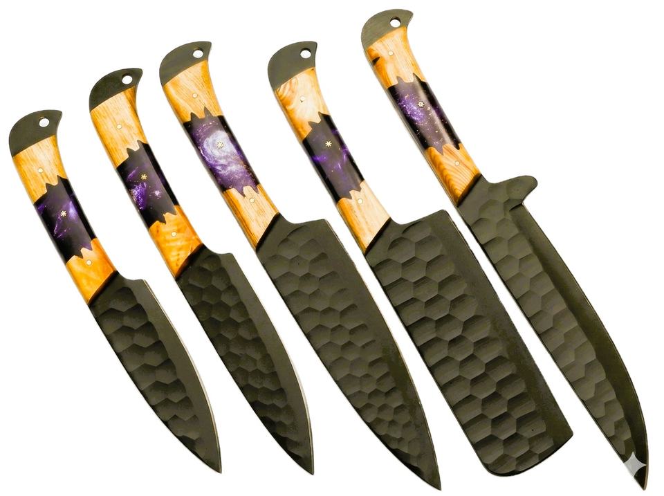 Ensemble de couteaux de cuisine en acier inoxydable faits à la main, 5 pièces, avec lames droites et manches en bois, série Titan Hammered