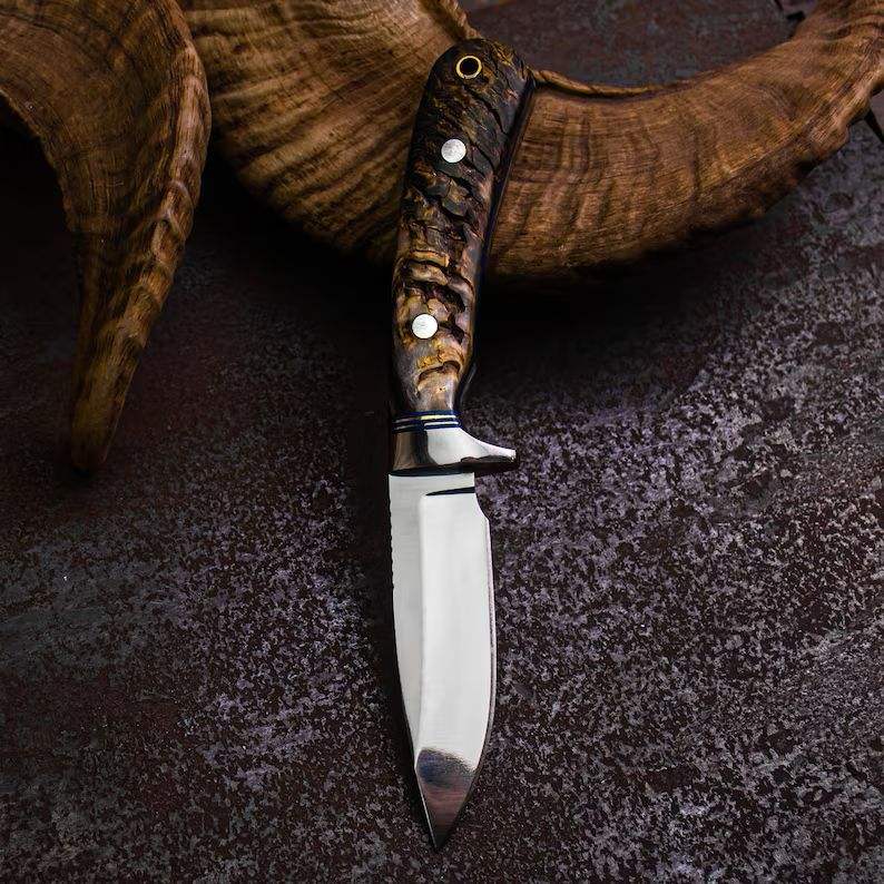 Couteau de chasse en acier fait main, manche en corne de bélier naturelle, couteau à dépecer personnalisé avec étui en cuir, acier 1095 de qualité industrielle