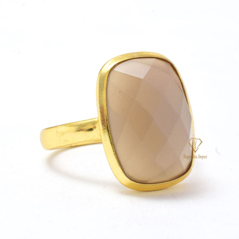 Handmade Sterling Silver 18K Gold Plated Solitaire Ring Natural Gray Moonstone Gemstone Set Bezel Setting Classic Cushion