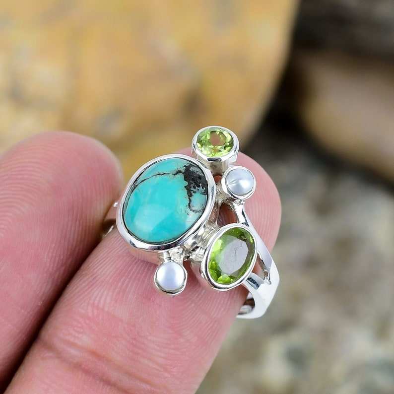 Bague en argent sterling fait à la main turquoise péridot perle Boho bijoux en cristal bague en pierres précieuses uniques
