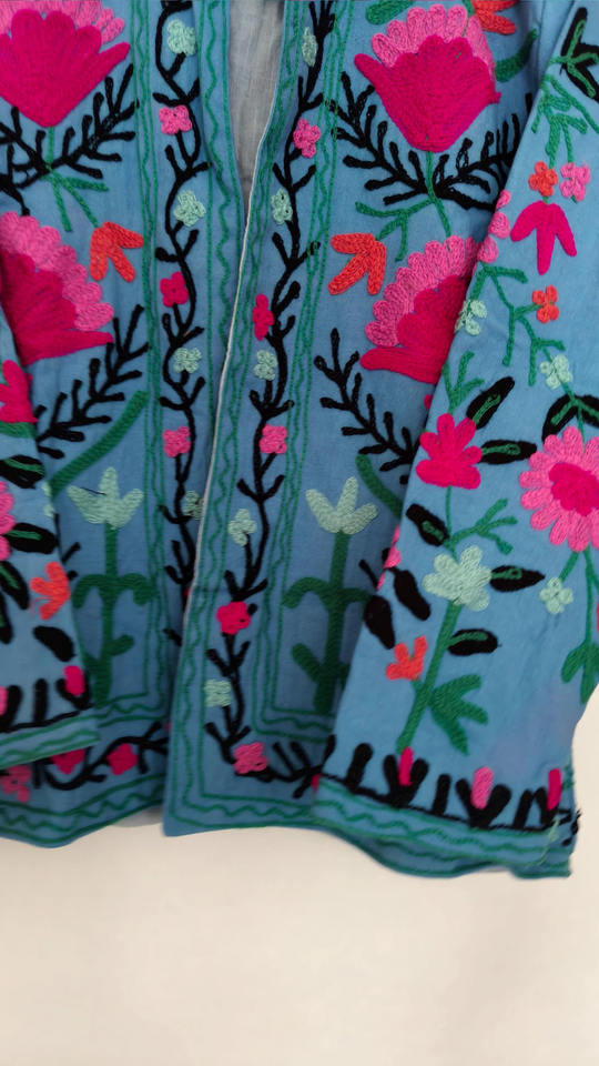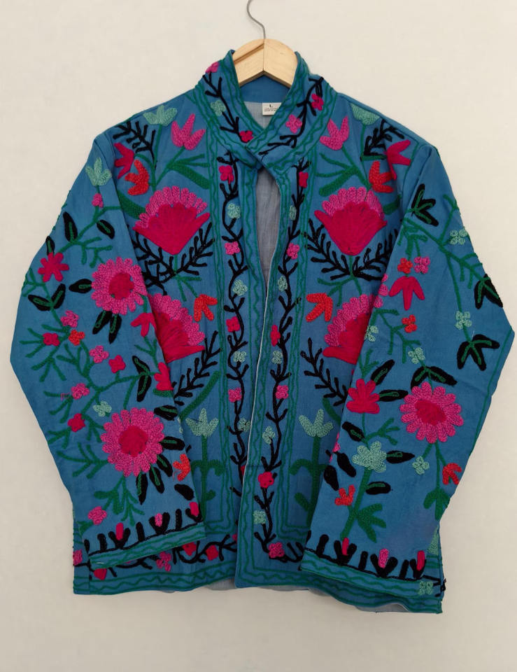 Veste matelassée en laine tricotée brodée Suzani faite à la main, écologique, respirante, artisanat culturel riche, broderie florale cousue à la main
