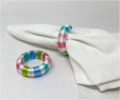 Anneaux de serviette faits à la main en fil coloré, style moderne, fils vifs mélangés, écologiques, durables, décoration de table pour mariages.