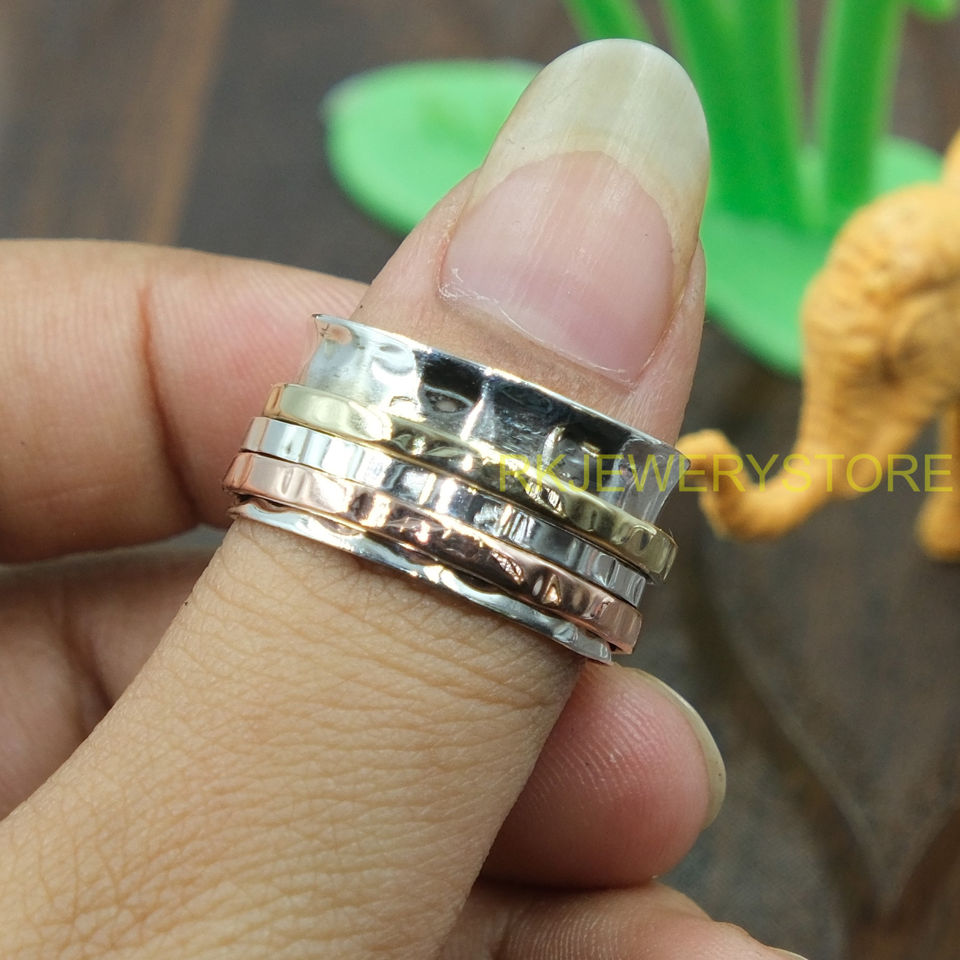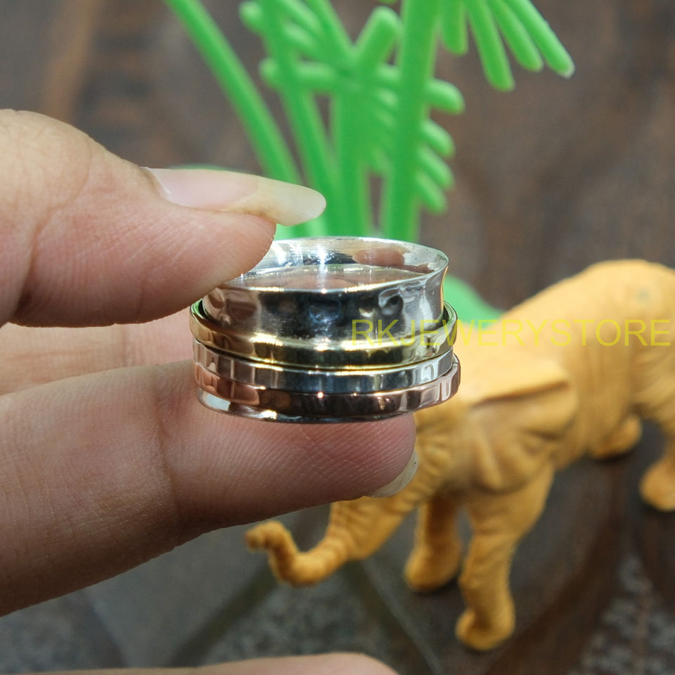 Bague tournante tricolore faite à la main en argent sterling 925, laiton et cuivre, large, style méditation bohème, bijou tendance pour femmes et hommes