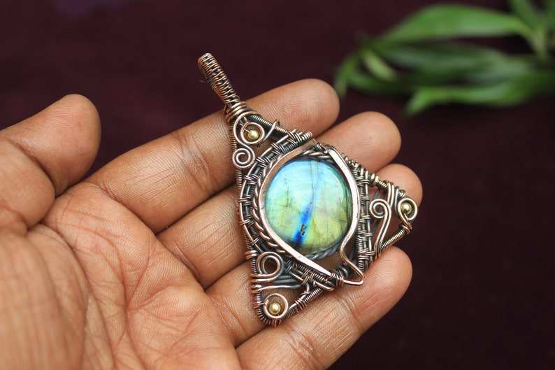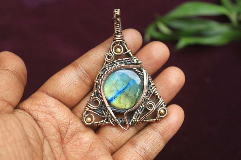 Triangle fait à la main fil de cuivre enveloppé jaune feu Labradorite pendentif Unique pierre naturelle bijoux cadeau