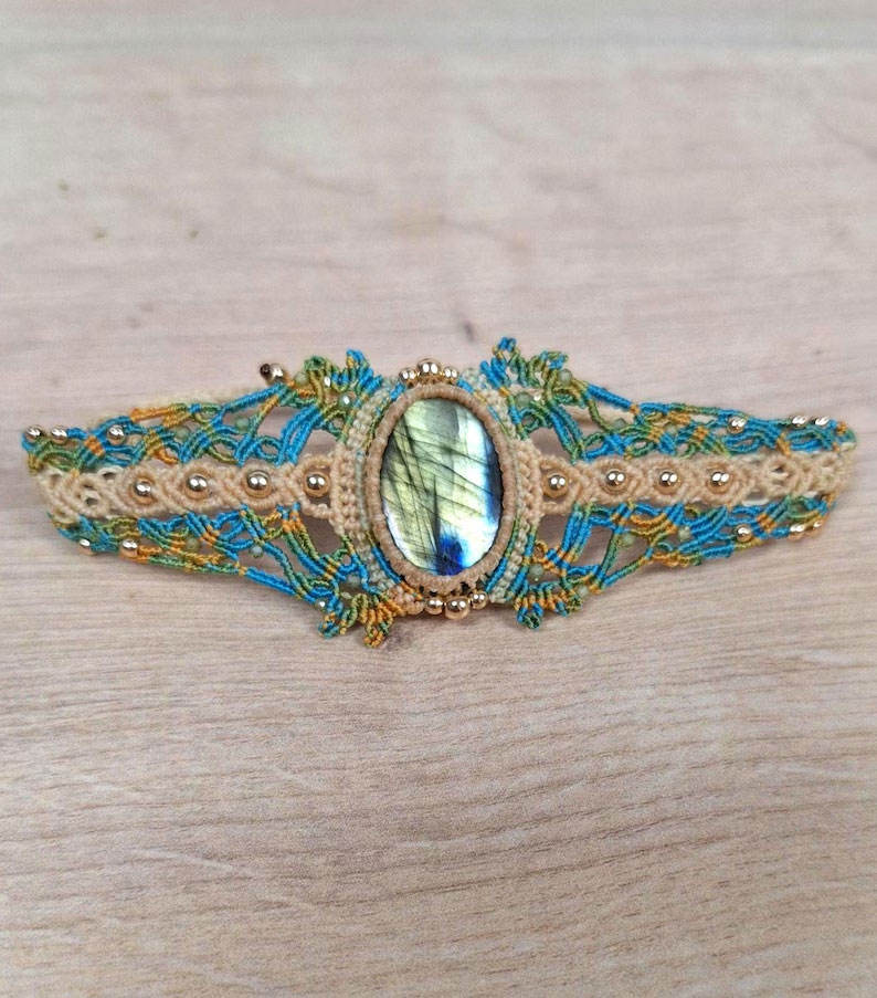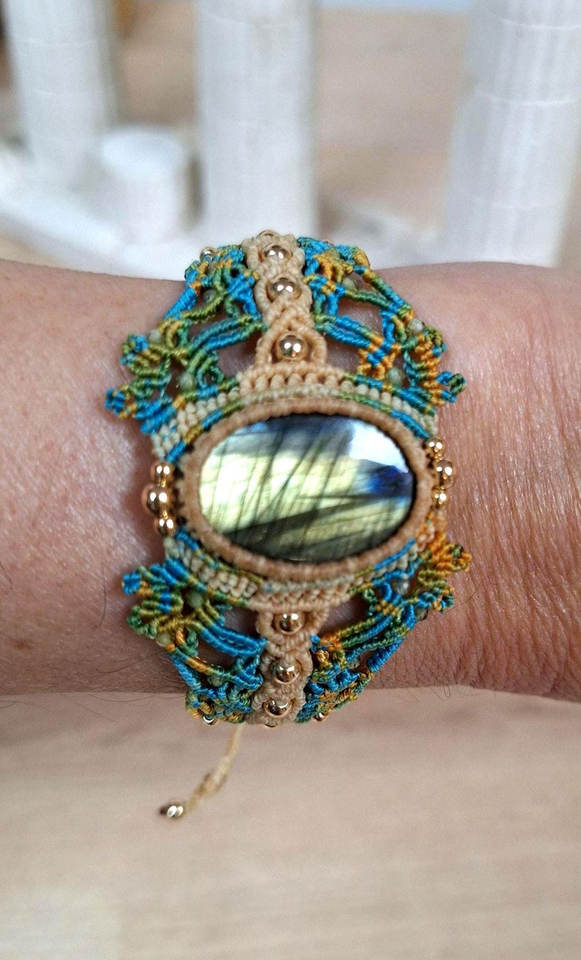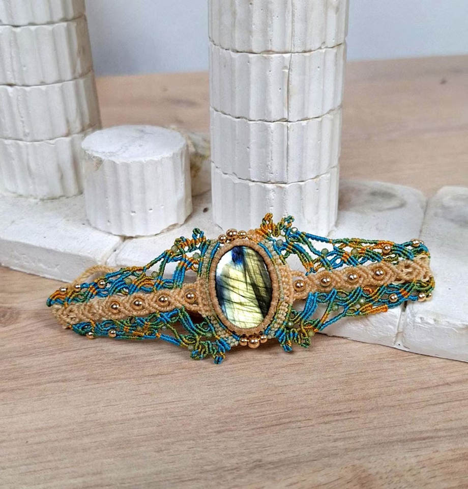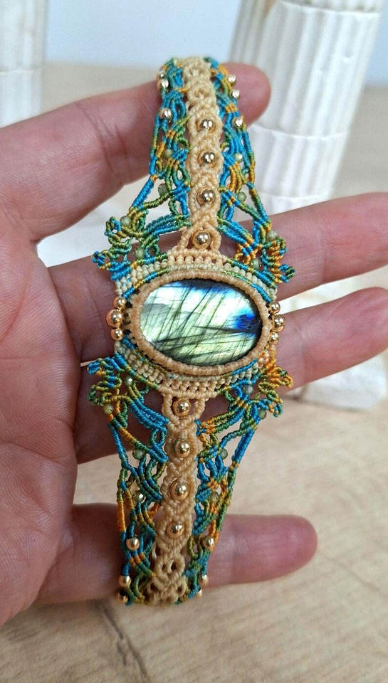 Bracelet Macramé Plaqué Or Vintage Fait Main avec Labradorite, Bijou Bohème en Cristal de Guérison, Manchette Tressée en Pierres Précieuses pour Femme, Idéal Cadeau