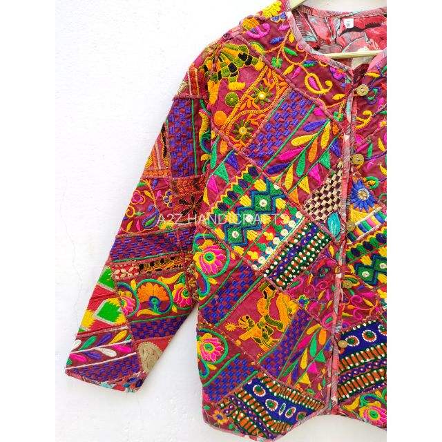 Veste Kantha Vintage faite à la main manteau brodé en cuir de peau de mouton Unique avec miroir indien travail coton remplissage inspiré Kimono