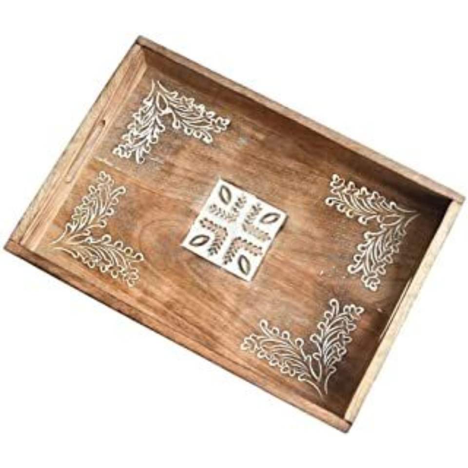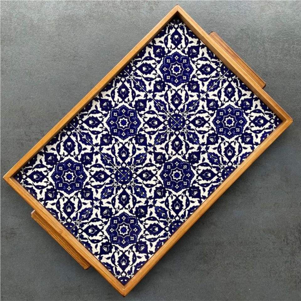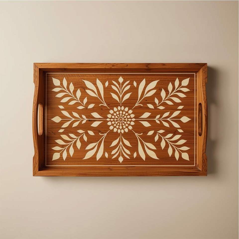 Plateau de service en bois de noyer fait main avec incrustations et poignées | Plateau ottoman décoratif en marqueterie florale pour table basse et décoration intérieure