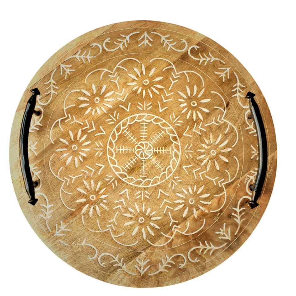 Plateau de service artisanal en bois de noyer avec incrustation florale en nacre blanche, style marocain, pour la décoration de table et l'usage domestique