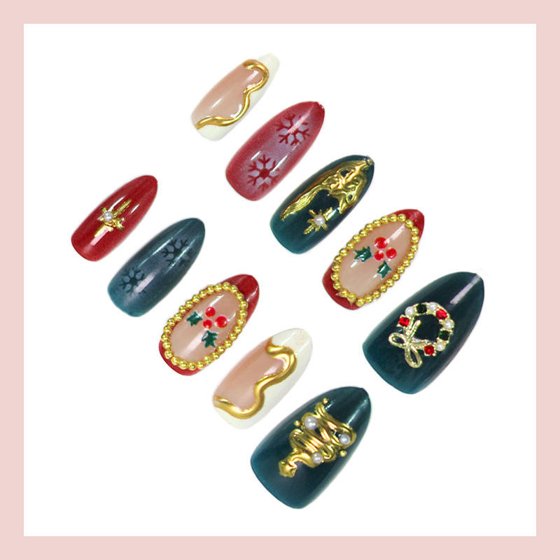Ongles artificiels faits main, forme amande, couleur unie, électroplaqués, pièces d'ongles décoratives, ongles amovibles prêts à poser, manucure de Noël
